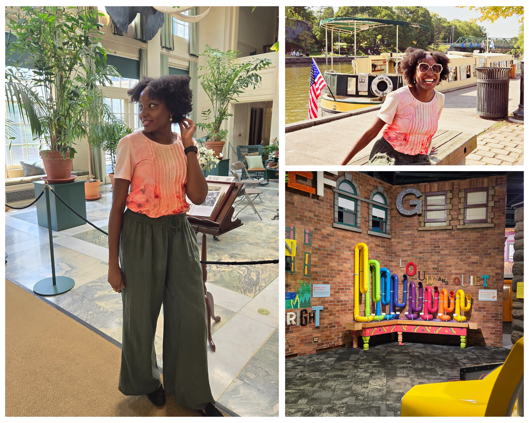 Black woman in a collage mix at Eastman House, Eric Canal cruise, and Strong Museum of Play in Rochester, NY